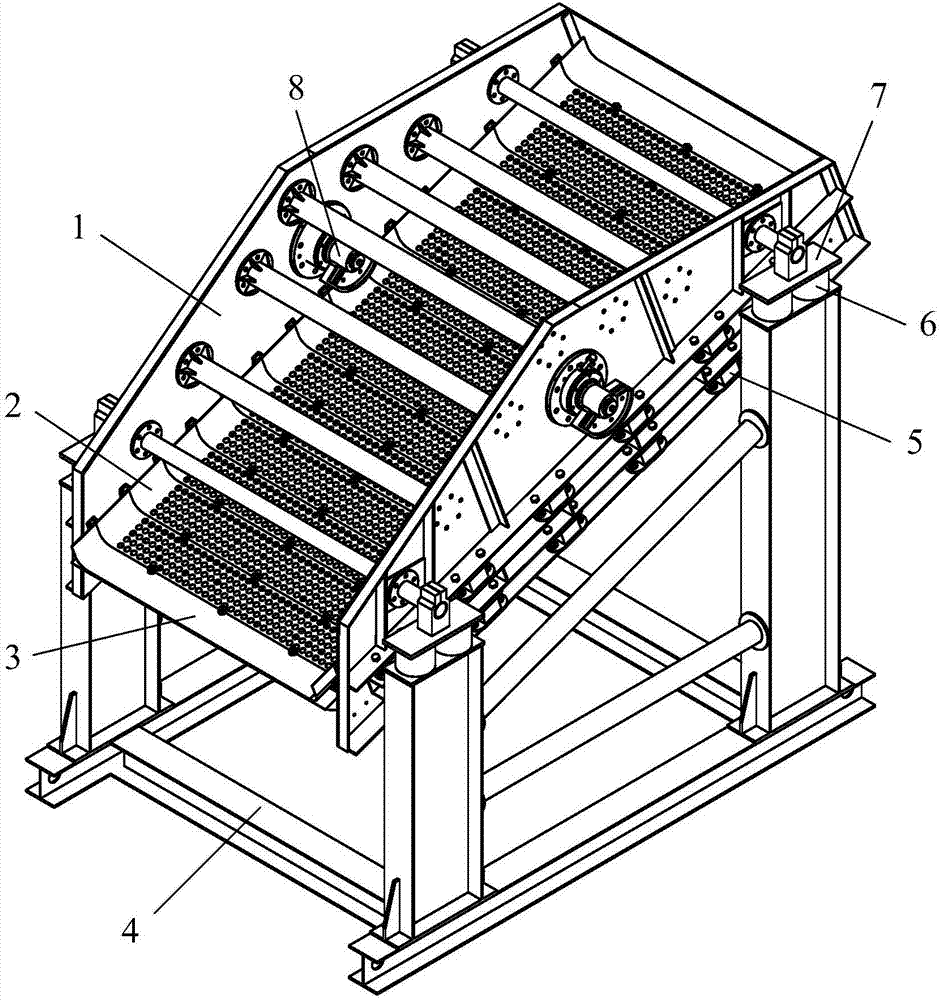 弛張篩是雙質(zhì)量振動系統(tǒng),采用聚氨酚橡膠篩面,支承篩面的任意兩根相鄰橫梁都分別屬于兩個振動質(zhì)體,其中一個質(zhì)體是篩箱,另一個質(zhì)體是配重。在工作時,篩網(wǎng)交替地拉緊和松弛,使物料產(chǎn)生前進(jìn)彈跳運(yùn)動,可避免物料黏附篩網(wǎng)并堵塞篩孔。當(dāng)兩質(zhì)體相差二相位振動時,任意兩根相鄰橫梁時而靠近,時而遠(yuǎn)離,彈性篩面也相應(yīng)時而松弛,時而張緊,即篩面隨篩箱作牽連運(yùn)動的同時,還相對篩箱作相對運(yùn)動。這種弛張運(yùn)動不僅使篩孔不斷產(chǎn)生變形,而且大大增加了篩面的振動強(qiáng)度,從而有效地克服了篩孔堵塞現(xiàn)象,顯著提高了篩機(jī)處理能力。但是因篩箱的振動強(qiáng)度并不大,故機(jī)械強(qiáng)度容易保證,但篩面的振動強(qiáng)度較大且反復(fù)變形,故篩面壽命較低。