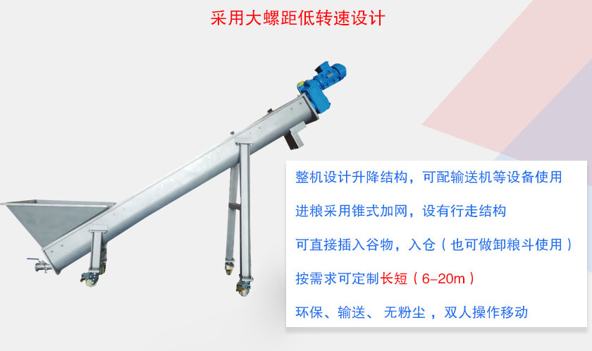移動式螺旋輸送機采用優(yōu)質(zhì)鋼管,整體鋼性好;雙節(jié)距葉片,減少物料輸送中被壓縮程度;采用優(yōu)質(zhì)減速箱,重型設(shè)計,具有轉(zhuǎn)矩大、噪音低等特性??蛇x萬向接球,使安裝調(diào)節(jié)轉(zhuǎn)向方便。配品質(zhì)優(yōu)良的中吊軸承,且方便安裝。